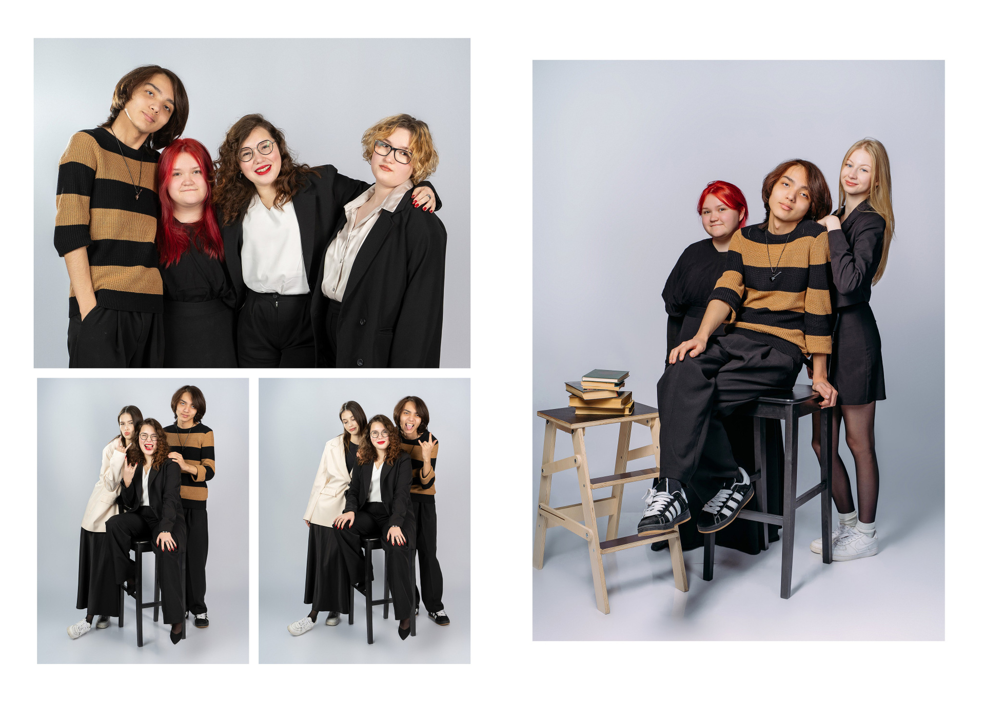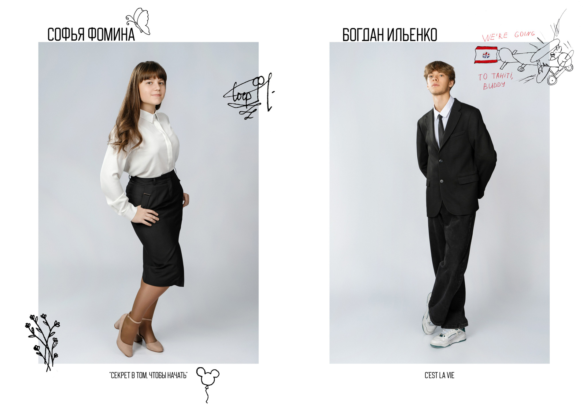 13 разворотов общие (одинаковые для всех): виньетка/ общие мальчиков и девочек/ / групповые разворот всего класса в школе или на улице / общая на весь разворот.
